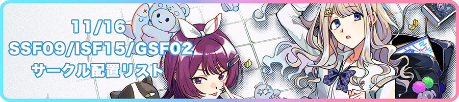 ---------------------------------------------------------------- ○次回開催について SHINY STAR FESTIV@L 09 2025年11月16日(日曜)12:00〜15:30 東京流通センター(TRC)第一展示場全ホール ※同時併催: IDOL STAR FESTIV@L 15/学園スターフェスティバル02 ------------------------------------------------------------------------------------------------------ ★2025.10.05 【サークル配置図+会場内配置図公開】 ●参加サークル配置リスト+会場内配置図を公開しました。 (PDFファイル 5.4M) ○サークル参加者向け宅配搬入要項を公開しました (PDFファイル) ○コスプレ・カメラ参加者向け当日利用案内を公開しました (PDFファイル) 全てトップページの各ボタンより閲覧可能です。 ------------------------------------------------------------------------------------------------------ ★2025.09.01 【SHINY STAR FESTIV@L09 イメージイラスト公開】 ・SSF09イメージイラスト第2弾を公開しました。 イラスト:かすてら 様(ヘルベチカステランダード) 【参加サークルリスト(最終)公開】 ・参加サークル最終リストを公開しました。(248サークル) 掲載のあるサークル様には全てスペース確定です。 ・スペース配置・サークル参加詳細については後日改めてご案内致します。 記載内容の誤りなどありましたら当会宛までご連絡ください ------------------------------------------------------------------------------------------------------ ★2025.08.08【参加サークルリスト(一次分)公開】 ○SSF09参加サークルリスト(一次受付分)を公開しました。 表記間違いなどありましたら当会宛までご連絡ください ※申込登録内容に不備のあった方は 「申込未完了」扱いとしておりますので 至急修正をお願い致します。 ○該当する不備実例 Xサークルカットデータ不備 ・データファイル名 ・カットデータサイズ(ピクセル) (当会指定サイズになっていないもの) ・カット絵の枠外・禁止場所へのはみ出のミス ・カット内サークル名無記載(無銘カット) X参加費入金確認が取れていない(未入金) は全て不備に該当しています。 申込についてはサークル様からの修正待ち状態 にて保留しておりますので至急修正手続きをお願いします。 他「申込したつもりで送信されていない」ケースも考えられます。 登録したメールアドレスに申込内容の写しメールが到着しているかどうか 確認してください その他不明な点は当会宛までお問い合わせください ---------------------------------------------------------------- ★2025.07.07【SSF09 サークル参加申込受付開始】 ○11/16 SSF09サークル参加申込オンライン受付を開始しました。 皆様のご参加お待ちしております。 参加登録手続きの際は 「サークル参加案内」の記載をご確認いただき 間違いのないようお願い致します。 ○サークル申込締切 一次締切:2025年07月31日 最終締切:2025年08月25日 ※サークルカットデータ再送手続の期限も同様です。 ---------------------------------------------------------------- ★2024.11.04 ●SSF08参加サークル サークルカットページ公開 ・参加サークル様のサークルカット閲覧が可能になりました。 当日販売予定のイベントパンフレットの先行公開となります。 少し重めのPDFファイルとなりますので通信量にご注意ください。 ---------------------------------------------------------------- ★2024.10.19 ●11/17 会場内配置リスト公開 ISF13及びSSF08の参加サークル配置リストを公開しました。 (PDFファイルが開きます) ●11/17サークル参加者向け 宅配便搬入案内を公開しました。(PDFファイル) ●(10/20追記) コスプレ・カメラ参加案内を公開しました(PDFファイル) ---------------------------------------------------------------- ★2024.09.06 ○SSF08/ISF13 参加サークルリストを公開しました。 (SSF08:251サークル ISF13:286サークル) 表記内容に誤りなどありましたら当会宛までご連絡ください ---------------------------------------------------------------- ★2024.05.12 ○6/23会場内配置図公開 SSF07/ISF12 会場内配置図およびサークルスペース配置を 公開開始しました。(PDFファイル) ○6/23参加サークル向け宅配搬入要項公開 ・当日サークルスペースへの宅配便搬入要項について 公開を開始しました。 トップページ>宅配搬入要項 より閲覧ください。 (PDFファイル) ---------------------------------------------------------------- ★2024.03.11 ○SSF07 全サークルリストを公開しました。(270サークル) ○SSF07メインイメージ第2弾を公開しました。 イラスト:イラスト:とらんど 様(すとらんど) フライヤーデザイン:桶沢 様(桶屋) ---------------------------------------------------------------- ★2024.02.20 SSF07メインイメージ第1弾を公開しました。 イラスト:りけ 様(ありけり) ---------------------------------------------------------------- ★2024.02.07 SSF07参加サークルリスト(一次申込完了分)公開 ・一次締切(1月31日締切)分の申込完了サークルリストを公開しました。 ※一次締切期間申込でまだ申込を完了していない方 (参加費未入金・修正事項未対応) また締切以降の申込分に関しては掲載しておりません。 ★2023.10.22 【パンフレット表紙イラスト公開】 ○ISF11イベントパンフレット表紙イラストを公開